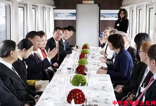 从苏黎世到伯尔尼列车行程约为1小时。在行驶的专列上,习主席和夫人彭丽媛受洛伊特哈德主席夫妇邀请,在轻松愉快的氛围中品茶畅谈。从照片来看,中瑞双方十多人出席,气氛相当轻松。