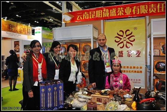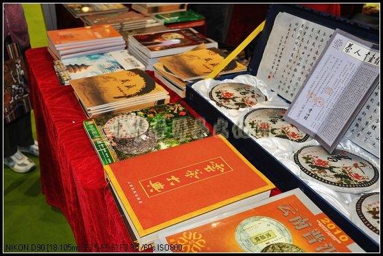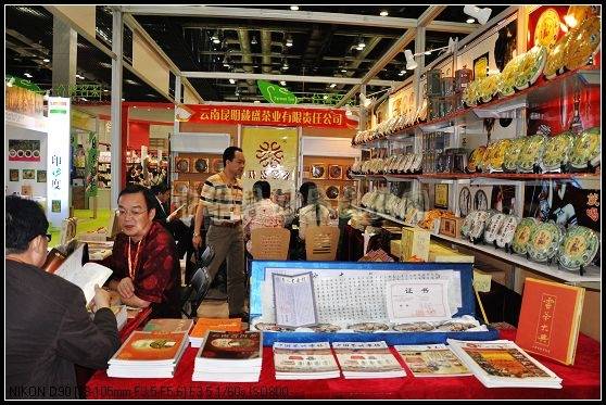 9月20日开展这天,早上八九点钟展馆里就已经是顾客云集,处处充满了喧闹声,各家的展位都已摆放整齐,准备迎接第一天的红火场面。昆明葳盛茶业公司是首次进京,展位面积并不算大,而且处于稍微偏一点的位置,但这并不影响它的人气。远远一看,展位非常醒目,因为富有云南民族特色,而且茶品种类多而新颖,很多人都不知不觉被吸引过来,他们有对云南少数民族感兴趣的、有对茶菁原料产区感兴趣的,有对茶文化书籍感兴趣的,且多数是年轻人、女孩,说明人们对普洱茶的认识越来越多、越来越广泛了。来者皆是客,泡台前围坐满了前来品茶的客人,茶艺师小荟“两手开弓”都快供应不上茶汤,虽然忙得顾不上吃饭,但看到那么多人喜欢我们的普洱茶,她还是乐此不疲的边为大家冲泡,边讲解每一款茶的滋味、特点以及原料的出处、相关的一些故事。有不少人看到我们摆放着很多书籍,都会问我们公司到底是卖茶还是卖书?真是有意思,因为大多数商家都没有把茶文化做得那么精深、细致。而惟独葳盛茶业公司一家有那么多的普洱茶文化书籍、刊物、资料,尤其经历了六年磨砺的《云南普洱茶春·夏·秋·冬》,近三十期一字排开,可谓云南普洱一条龙之杂志。所以很多茶友在喝了我们的茶、看过我们的书籍之后深深感言:你们确实是有实力、有底蕴的,你们的茶饼不是空洞的,而是每一款茶都有它的故事、来历,每一款茶从原料的采集、加工、制作到成品一系列过程均是严格把关、认真对待,是用心做出来的茶,所以这茶喝起来才会与众不同,才会让人流连忘返!