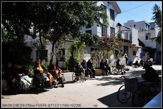 院子还算宽敞,四周是几幢分开的楼房,供老人居住,楼房前有一圈过道供老人活动、散步。