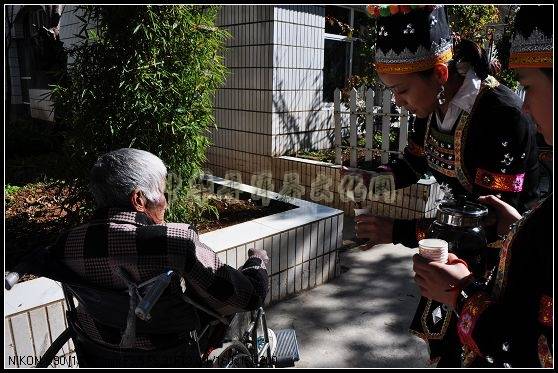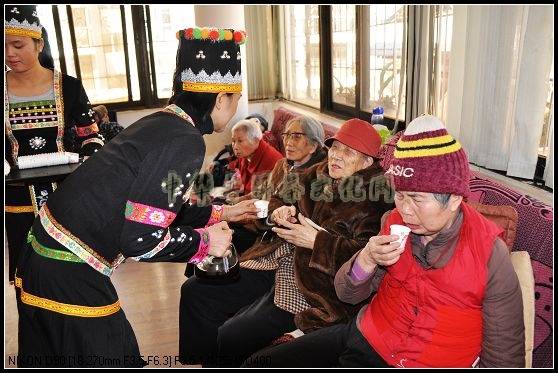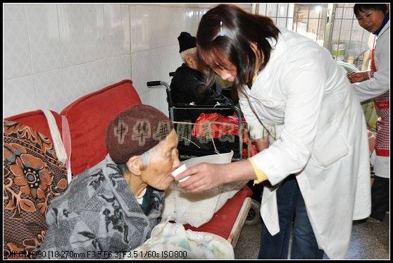应该有的传统美德。镜头三是:我们的同事在为老人奉茶水时,茶水还有些烫,同事就都是用两个杯子把茶水弄凉一点再喂老人喝。尽管是简单的举动,也说明了同事们的一片爱心。