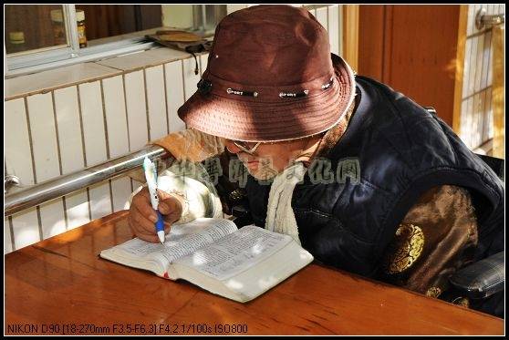 奉茶水的这个过程让我感触颇深。很多个情景深深的打动了我,至今任历历在目,令我终身难忘。镜头一是:在一个过道旁的小桌子上,摆放着一本厚厚的词典,上面的字小而且密密麻麻的,一位老人戴着老花镜全神贯注的在一边看一边还用笔作着记号。她专注的神情让我莫名的感动!在这个地方,或许这就是她