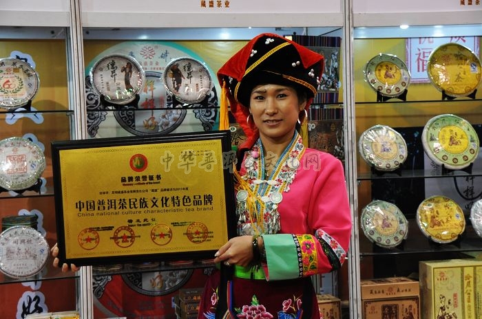 葳盛茶业分公司经理李朝荟手举“中国普洱茶民族文化特色品牌”奖牌