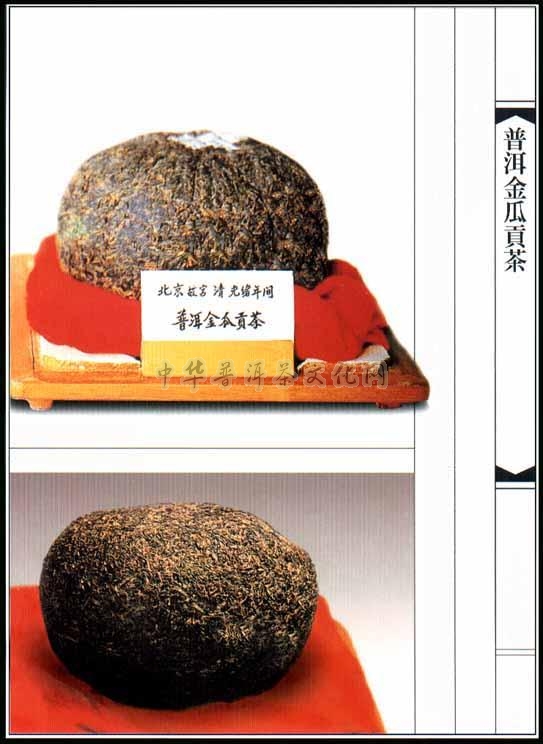 普洱贡茶,雍正十年,即公元1732年正式列入贡茶案。当时,云南总督鄂尔泰在普洱府宁洱县(今宁洱镇)建立了贡茶厂,选取西双版纳最好的女儿茶,以制成团茶、散茶和茶膏,敬贡朝廷。清人赵学敏《本草纲目拾遗》云:“普洱茶成团,有大中小三种。大者一团五斤,如人头式,称人头茶,每年入贡,民间不易得也”。 制贡茶的茶叶,据传均由未婚少女采摘,且都是一级的芽茶。采下的芽茶一般先都放之于少女怀中,积到一定数量,才取出放到竹篓里。这种芽茶,经长期存放,会转变成金黄色。普洱团茶大者如西瓜(略扁),小的如网球、乒乓球状,茶色褐黑,不霉不坏,保存完好。茶团表面有拧紧布纹的印痕,可见当时制茶是用布包着揉紧、干燥成型的。