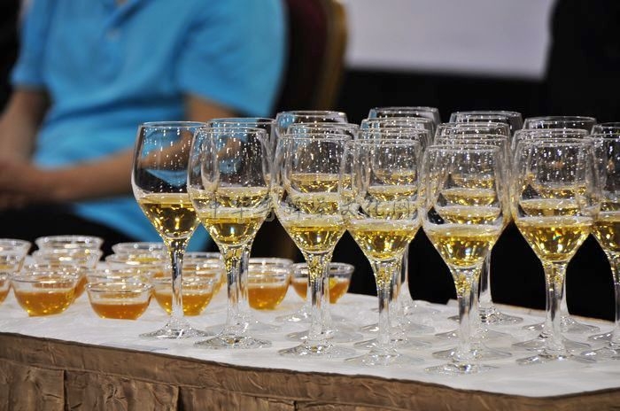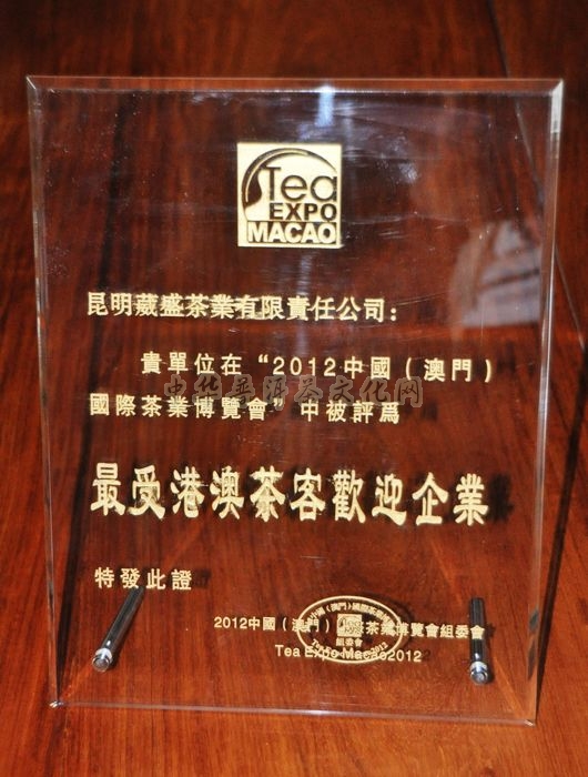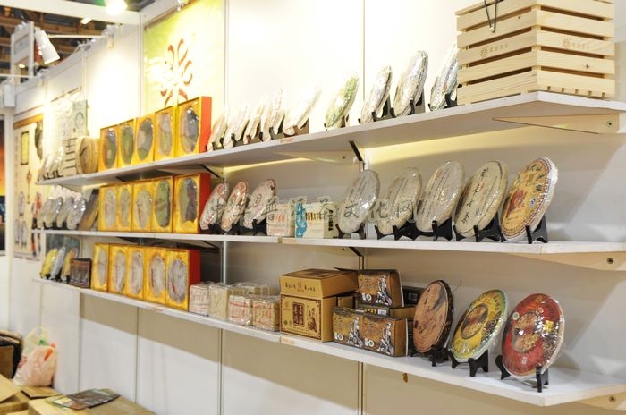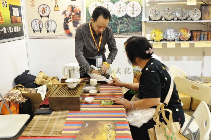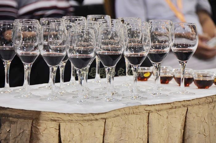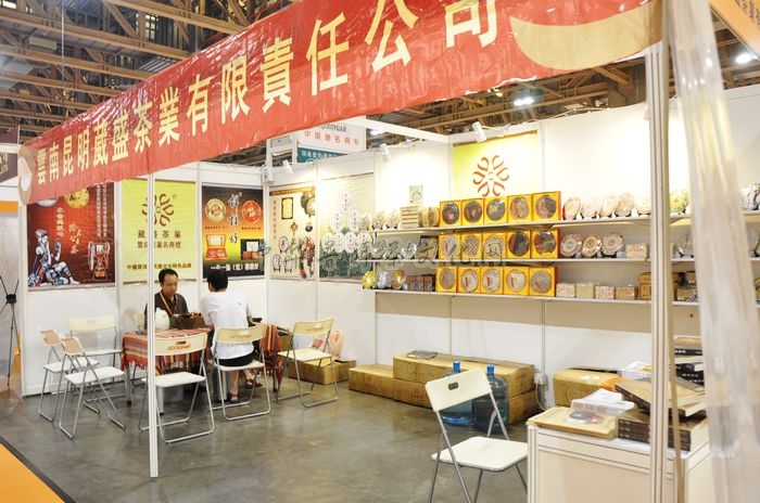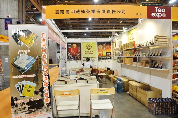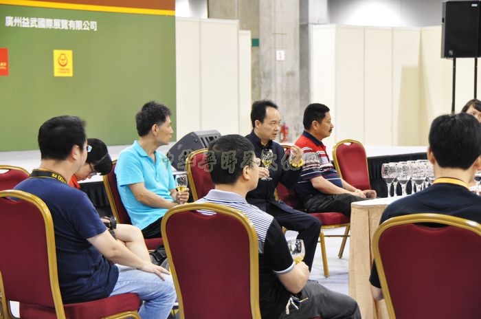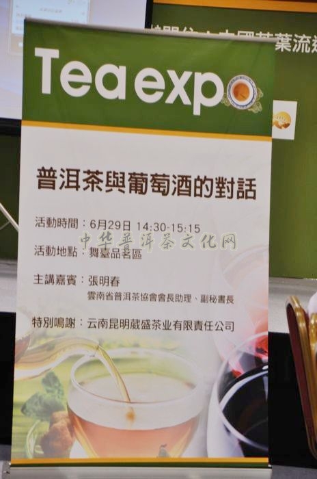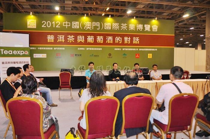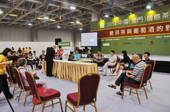 云南昆明葳盛茶业有限责任公司董事长张明春先生(主席台左二)现场引领嘉宾品饮普洱茶与葡萄酒