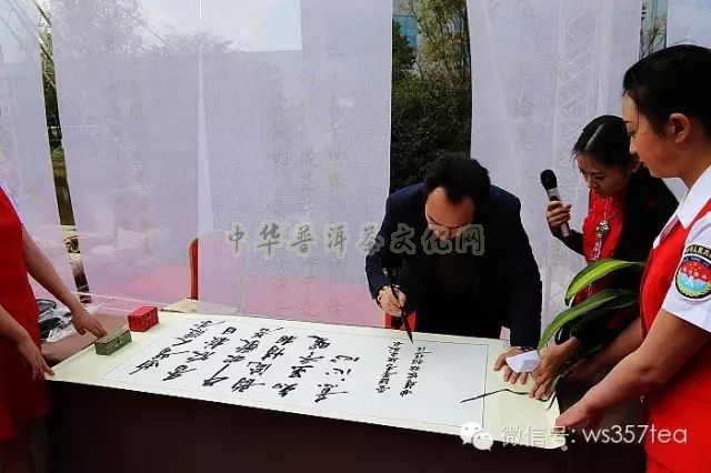蓝天、白云、依水、品茶,惬意十分 采珠江源头之水冲泡爱随茶香普洱茶 珠江流域滇、黔、桂、粤四省领导和专家的题词 葳盛茶业董事长张明春先生现场题词以抒发饮水思源之深情、畅享普洱之幽意
