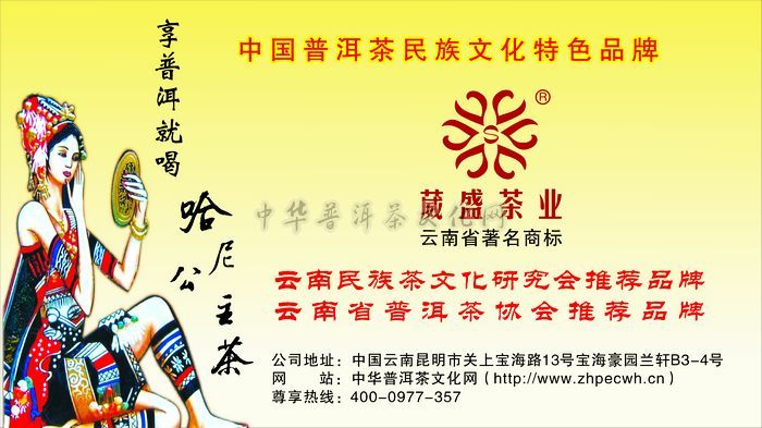 昆明葳盛茶业有限责任公司自2004年便开发研制哈尼公主茶,是经国家工商总局商标局批准注册,打造民族普洱茶文化代表品牌,代表葳盛印象和体现文化普洱的云南较有影响的现代普洱茶品牌,并获得其商标专利权。哈尼公主茶融合了中国茶文化、中国书法文化和云南民族文化的神韵,原料采用澜沧江流域中国茶都普洱区域无量山系原始深山大叶种乔木古树茶,茶菁采撷于清明前第一批春茶,是真正无公害、无污染的绿色健康饮品,滋味醇浓甘爽,幽香如兰,韵味独具,其加工工艺是按照云南普洱茶哈尼族民间传统制作工艺加工而成。该茶曾于2006年中国(广州)国际茶业博览会上荣获全国名优茶评比金奖,2008年又荣获“金芽奖”中国普洱茶十大最具潜力品牌,并被云南普洱茶协会指定为第一饼普洱茶地理标志证明商标样榜茶,多年来受到了国内外普洱茶爱好者的青睐和喜爱。