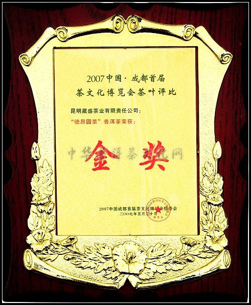 2007年中国成都首届茶文化博览会茶业评比中,昆明葳盛茶业有限责任公司“德昂圆茶”普洱茶荣获“金奖” 公司邮箱:ws357Tea@126.com 公司网站:中华普洱茶文化网 公司网址:http://www.zhpecwh.cn 公司地址:云南省昆明市关上宝海路163号 联系电话: 0871—63559399(办公室) 全国尊享热线:400 0977 357 在线QQ联系:348058891 564855862