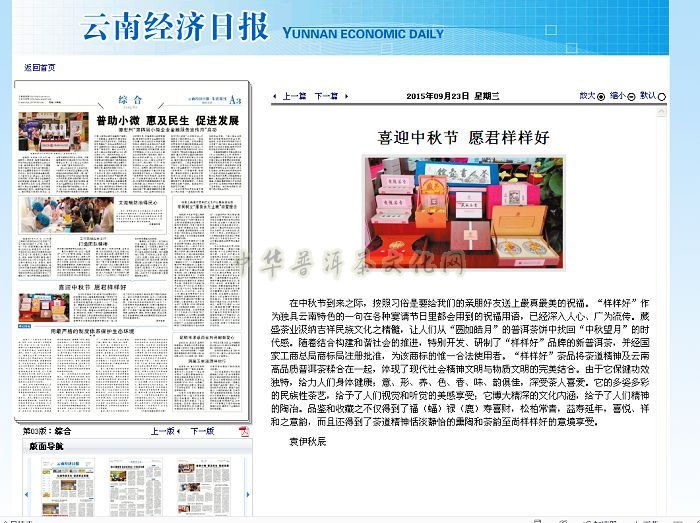 中华民族传统文化博大精深,每个月里都有各种节庆日,八月十五恰在秋季的中间,故谓 之中秋节。在如此隆重的节日到来之际,按照习俗是要给我们的亲朋好友送上最真最美的祝福。而“样样好”作为独具云南特色的一句在各种宴请节日里都会用到的祝福用语,已经深入人心、广为流传,它囊括了各方各面的美好祝愿,即所有的一切都好!葳盛茶业汲纳吉祥民族文化之精髓,让人们从“圆如皓月”的普洱茶饼中找回“中秋望月”的时代感。随着结合构建和谐社会的推进,特别开发、研制了“样样好”品牌的新普洱茶,并经国家工商总局商标局注册批准,为该商标的惟一合法使用者。“样样好”茶品将茶道精神及云南高品质普洱茶糅合在一起,体现了现代社会精神文明与物质文明的完美结合。由于它保健功效独特,给予人们身体健康,