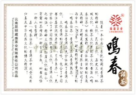 “鸣春”二字与明春先生谐音,“鸣”鸟兽的叫声,寓意为自然朴实的自然声音,一为唤醒人们对普洱茶重新认识与理解,二成为人们对普洱茶口感记忆的存储箱!明春先生希望喝过“鸣春”茶,达到雁过留声的意境与冥想!“禅茶一味的理念”喝这款茶达到静心、养性修身的目的。