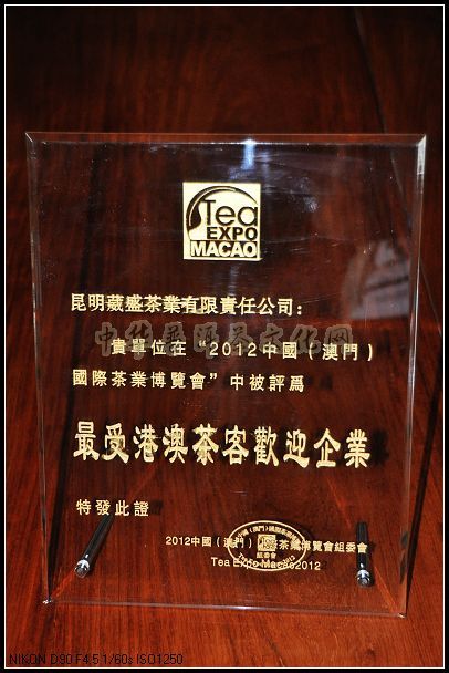 昆明葳盛茶业有限责任公司在“2012中国(澳门)国际茶业博览会”被评为“最受港澳茶客欢迎企业”