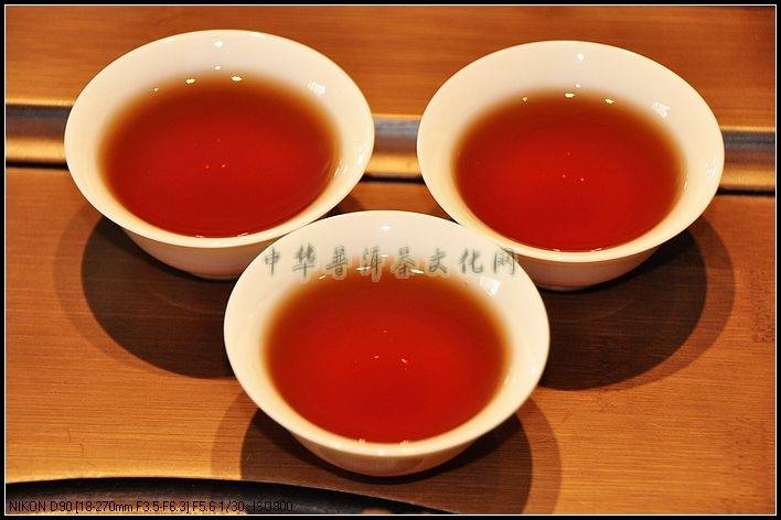 汤色:茶汤清澈透亮、呈宝石红、粘稠泛油光