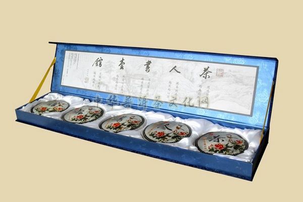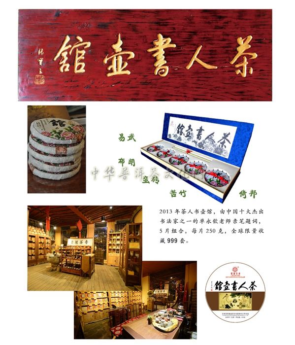 2013年重新打造了更加精致独具韵味的精巧套装【茶人书壶馆】普洱茶,由中国十大杰出书法家之一的单永钦老师亲笔题词,充分融合了中国传统文化、历史文化、书画文化及普洱茶文化的丰富内涵,是中国茶道精神在当代茶文化事业中的具体体现,是弘扬和传承普洱茶文化的精品代表。“茶、人、书、壶、馆”五个字包含着做人、做事、修身的人生哲理,这五片茶原料分别采用澜沧江流域江内外的倚邦、苦竹、蛮砖、布朗、易武最具综合代表性的五大著名茶山大叶种古树茶菁,集纳了云南高山云雾出好茶的乔木大叶种古树茶的色、香、味、形、韵的精华与特点,是真正无公害、无污染的绿色健康饮品,每片250克,全球限量收藏999套。