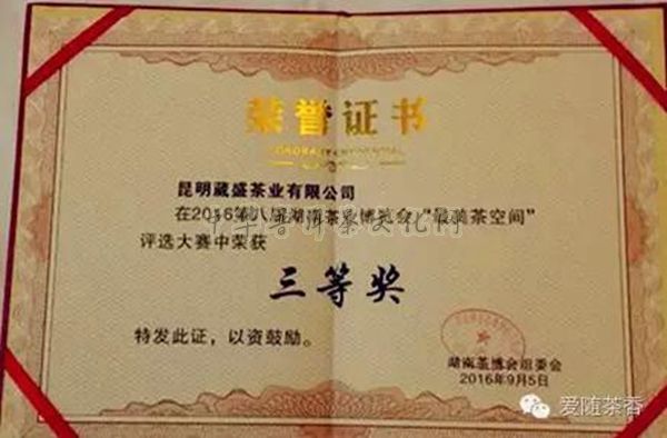 2016第八届湖南茶业博览会(简称茶博会)9月5日落下帷幕。在此次茶博会上,葳盛茶业在此次茶博会“最美茶空间”活动评选大赛中荣获三等奖。
