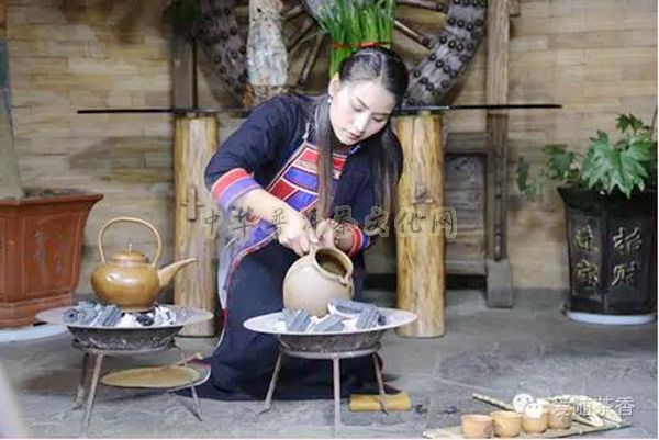 天渐渐暗了下来,夕阳展开它温柔的双臂抱住了世界,在它的怀抱中一切都是那么的恬静美丽,劳作了一天的佤族姑娘卸下疲倦。升起炉火,架起瓦罐,勤劳的佤族姑娘轻轻地将特制的地谷红米拨入土罐,烤炙一到两分钟,缓缓颠簸茶罐,使红米的香味更醇。一会儿,一股由远及近的焦香味从土罐中慢慢散开……然后将它置于一旁。
