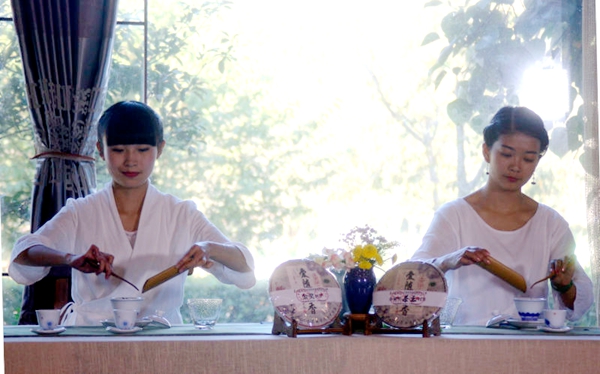 现在向我们走来的是葳盛优秀茶艺师徐莹,手持葳盛普洱——『茶人书壶馆』