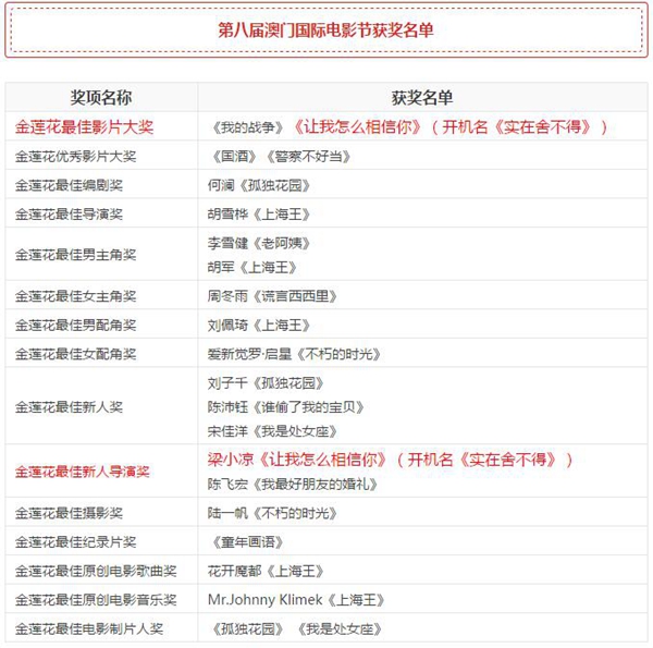 近来,好消息又传来,在刚刚结束的第八届澳门国际电影节上,由葳盛茶业支持拍摄的电影《让我怎么相信你》(开机名《实在舍不得》)从入围的五十多部影片中杀出重围,获得第八届澳门国际电影节压轴大奖——最佳影片奖,该片导演梁小凉获得最佳新人导演奖!