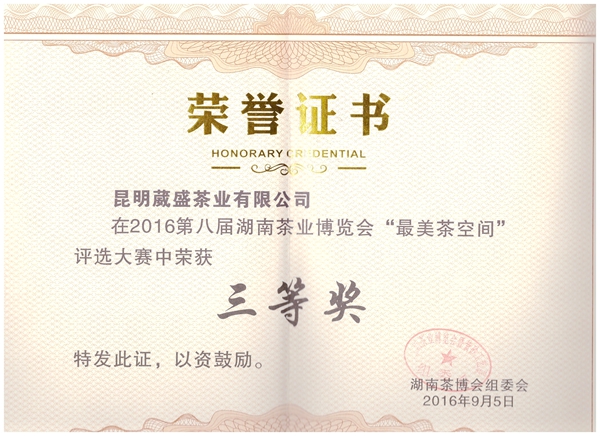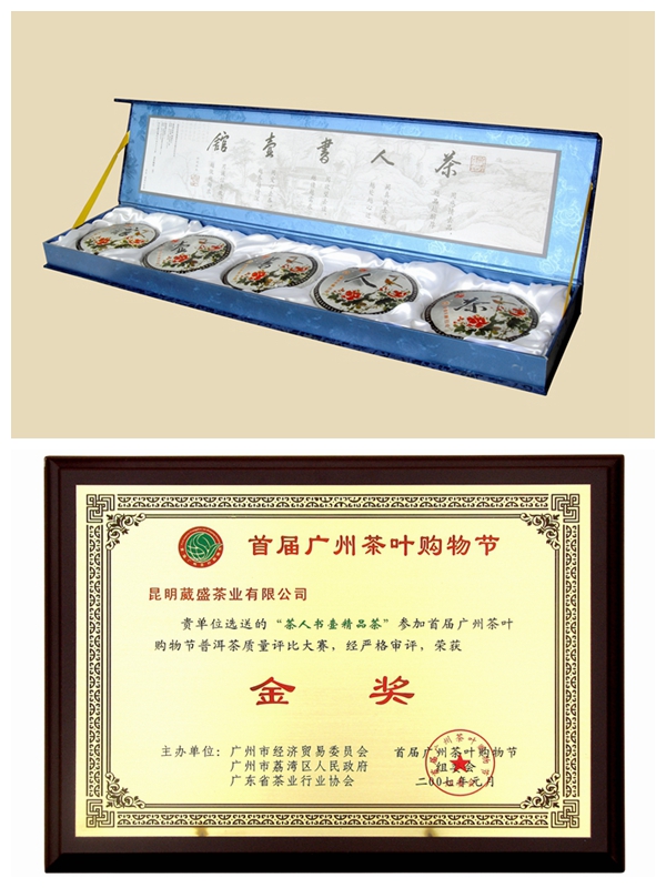 2007年1月葳盛茶业公司选送“茶人书壶馆精品套茶”参加首届广州茶叶购物节普洱茶质量评比大赛,经严格审评,荣获“金奖”