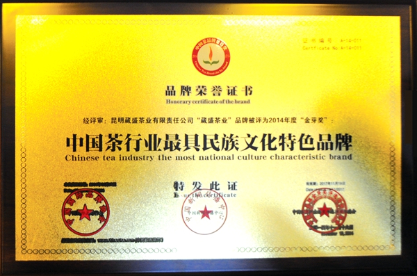 2011年葳盛茶业荣获“中国普洱茶民族文化特色品牌”荣誉称号