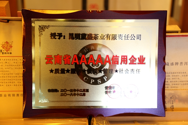 2015年葳盛茶业荣获集“质量、服务、债权、管理、社会责任”优质的“云南省AAAAA信用企业”称号