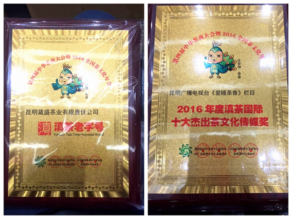 在本届年会上,葳盛茶业斩获多项大奖,其中昆明葳盛茶业获滇茶老字号、葳盛茶业旗下云南爱随茶香茶业有限公司获2016年度昆明茶业协会会长质量奖、昆明广播电视台《爱随茶香》栏目组获滇茶国际十大杰出茶文化传媒奖荣誉大奖。