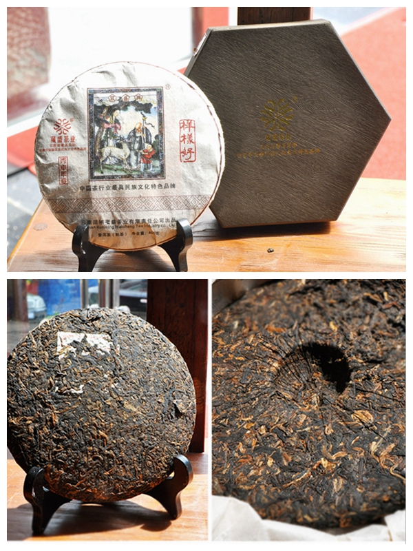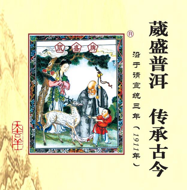 葳盛茶业“葳盛牌样样好”普洱茶上的吉祥图包含了寿星、顽童、梅花鹿、勤劳的姑娘、还有苍劲的松柏,外面以蝙蝠、水仙花、铜钱为主,涵盖吉祥文化福禄寿喜财。寓意:福(蝠)禄(鹿)寿喜,松柏延年,喜悦,祥和之情。