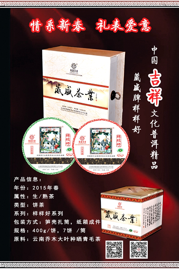 【葳盛牌样样好】普洱茶是云南生态、质朴、纯真的普洱茶代表,该茶品于2011年春精心研制开发,以普洱茶民间传统工艺精制而成,2013年春开发研制出中国吉祥文化与普洱茶文化的完美结合之尚品“大吉祥 葳盛牌样样好”,继2013年之后2015年开发精制“葳盛牌样样好”。在这快节奏的现代生活中,和谐是喜,平安是福,快乐是金,宁静是宝,样样好已成为人们表达美好祝愿的佳音。