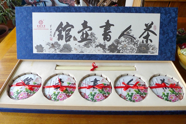 2013年重新打造了更加精致独具韵味的精巧套装【茶人书壶馆】普洱茶,由中国十大杰出书法家之一的单永钦老师亲笔题词,分别由倚邦、苦竹、蛮砖、布朗、易武5片组合,每片250克,全球限量收藏999套。