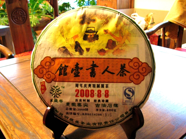 2006年8月8日,葳盛茶业第一款【茶人书壶馆】诞生,一套五片,每片400克,选用澜沧江流域江内外的勐宋、易武、巴达、景谷、无量山系最具综合代表性的五大茶山大叶种古树茶箐为原料。