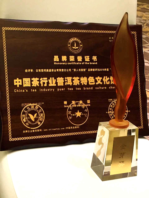 2016年12月,云南昆明葳盛茶业有限责任公司『茶人书壶馆』品牌被评为2016年度“金芽奖”中国茶行业普洱茶特色文化馆品牌。