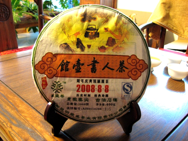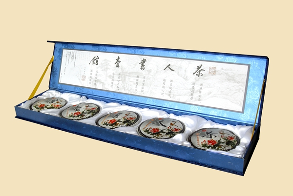 首批2006年【茶人书壶馆】茶是由5个不同山头的古树组合而成的。每片400克,选料分别是:茶—勐宋、人—易武、书—巴达、壶—景谷、馆—无量山 。再加上精心设计的精美礼盒 ,以蓝色为底,山水画为图,清雅朴素,内中白色缎匣底衬与石模精压的5饼茶组十分和谐。每饼茶的外包装纸是花鸟图案,十分幽雅,特别而精制的证书上有云南普洱茶协会会长张宝三、云南民族茶文化研究会会长李师程的题词和签名。限量999套,现在售价22500元/套。