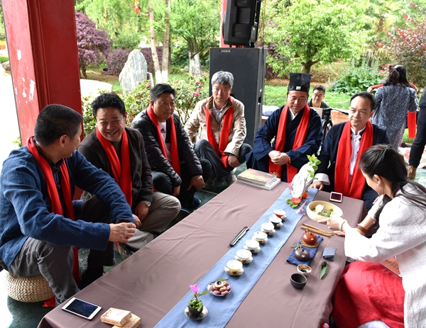 20174月18日昆明茶叶行业协会刘益成会长、中国道教协会副秘书长、云南省道教协会会长廖东明道长、云南昆明茶叶行业协会文化顾问、中国茶人发展联盟高级顾问,“滇茶国际十大功勋人物”、“燕赵茶坛三剑客”之一的尹纪周;葳盛茶业董事长、制茶匠人张明春、黑龙潭公园管委会主任陈越及京津冀访茶团一行共同参加茶会。