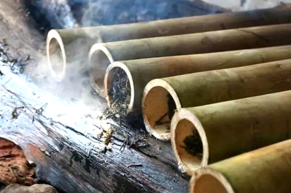 烤茶:将装有茶叶的竹筒,放在火塘三脚架上烘烤,约6~7分钟后,竹筒内的茶便软化。