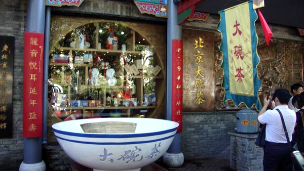 尤其是北京的大碗茶,更为出名。喝大碗茶的场所,无须楼堂、馆所,摆设也比较简便,往往是一张方桌,几根条凳,一把大茶壶,两只大木桶,几只粗瓷大碗。因此,通常在门前屋檐下,或搭个简易凉棚,以茶摊形式出现,主要为过往客人祛暑解渴提供方便。