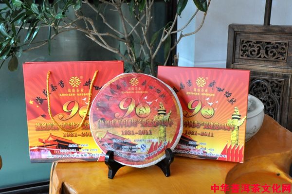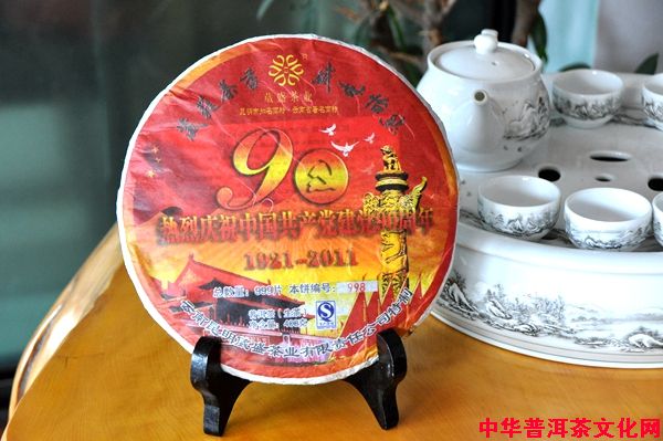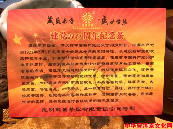 在喜贺中国共产党90岁生日的同时,昆明葳盛茶业有限责任公司荣获昆明市知名商标、云南省著名商标,在这意义深远的历史时刻,为弘扬普洱茶文化,提升普洱茶品味,推动普洱茶市场的良性发展,特别开发、研制建党90周年纪念茶,向中国共产党90岁生日献礼。90周年纪念普洱茶至今已有6岁啦,在以后的日子里,它将始终如一地伴随着党的成长,见证党的光辉历程。