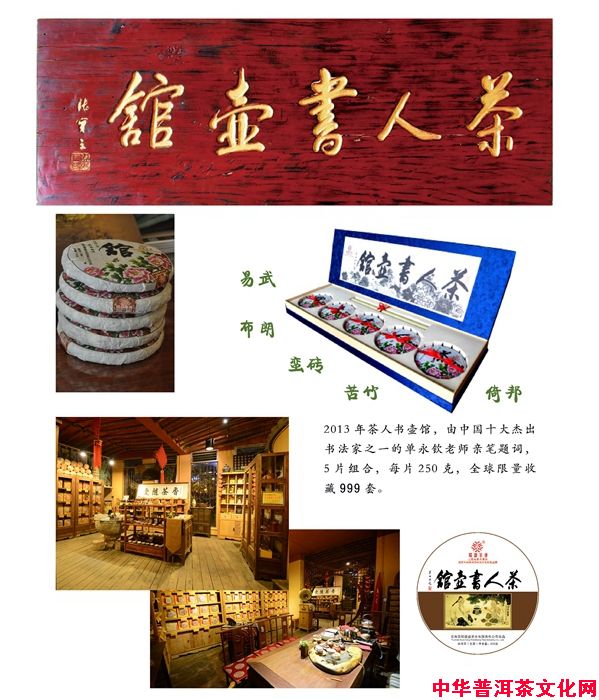 2013年,葳盛茶业重新打造了更加精致独具韵味的精巧套装【茶人书壶馆】普洱茶。由中国十大杰出书法家之一的单永钦老师亲笔题词,分别由易武、布朗、蛮砖、苦竹、倚邦5片组合,每片250克,全球限量收藏999套。