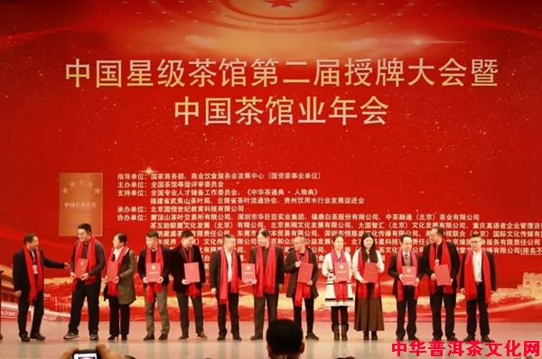由全国茶馆等级评审委员会主办的中国星级茶馆第二届授牌大会暨中国茶馆业年会于1月18日在北京全国政协礼堂隆重举行。商业饮食服务业发展中心主任徐晶龙、国务院办公厅行政司原巡视员兼副司长王胜利、商业饮食服务业发展中心副主任、全国茶馆等级评审委员会主任孙喆、中茶院名誉院长、《中华茶通典》执行总编于观亭等相关政府、企业、事业单位领导及品牌企业嘉宾、星级茶馆负责人、星级茶馆评审员、各界专家、委员会各地方秘书处负责人、央视网、人民政协报、天下茶友网、茶旅世界等媒体出席本次年会。