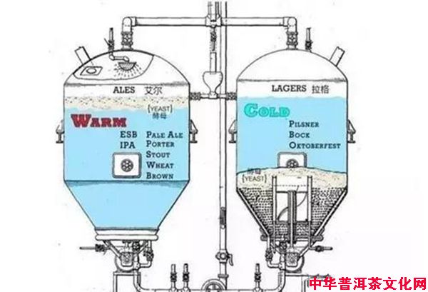 精酿啤酒和工业啤酒的发酵工艺也有所区别,通常精酿啤酒采用的是艾尔工艺(Ales,上发酵工艺),工业啤酒采用的是拉格工艺(Larges,下发酵工艺),二者最主要区别是发酵过程中酵母所在的位置和发酵温度不同。如图所示: