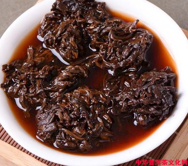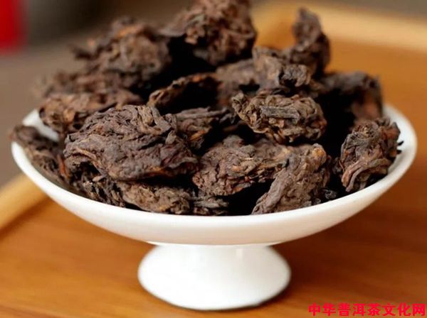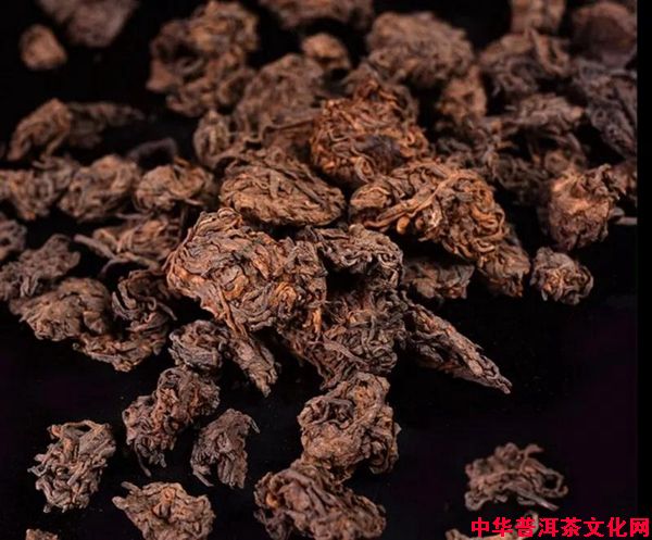 这些果胶会把周围的茶叶粘连在一起,变成一团一团的,发酵到一定程度后,这些一团一团的茶叶被挑拣出来,经过人工分解成小块。由于是自然结块,没有经过人工的修饰,它的品相并不好看,就像是一小块一小块的深褐色的面疙瘩,所以又被称为“疙瘩茶”。