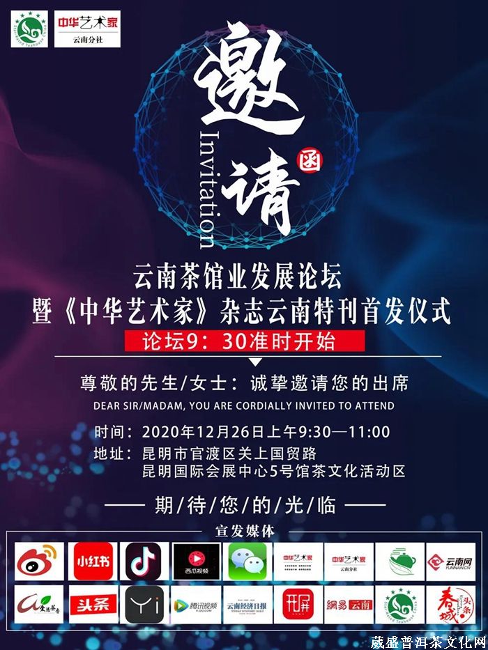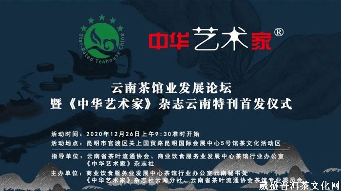 值此茶届盛世之际,云南葳盛文化传播有限公司携手《中华艺术家》杂志社云南分社、商业饮食服务业发展中心茶馆行业办公室云南秘书处、云南省茶叶流通协会茶馆专委会,在云南省茶叶流通协会、商业饮食服务业发展中心茶馆行业办公室、中华艺术家杂志社的指导下,于12月26日上午在昆明国际会展中心(关上)5号馆隆重举办“云南茶馆业发展论坛暨《中华艺术家》杂志云南特刊首发仪式”,诚邀茶友现场共同见证!