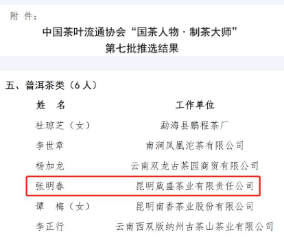 11月18日,中国茶叶流通协会组织推选的第七批“国茶人物·制茶大师”名单正式公布,昆明葳盛茶业有限责任公司创始人张明春先生荣获普洱茶类“国茶人物·制茶大师”称号。