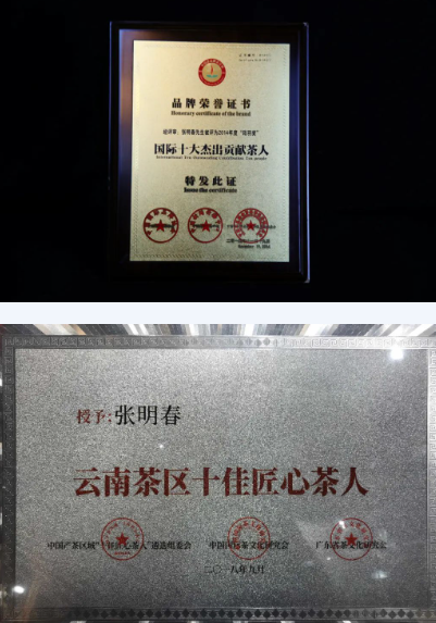 由张明春先生研发制作的“哈尼公主”、“德昂”、“样样好”、“滇茸”、“爱随茶香”、“茶人书壶馆”等系列品牌茶品在省内外名优茶品评比中曾多次荣获金奖和银奖。