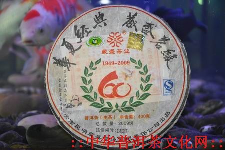 喜逢盛世甲子,昆明葳盛茶业有限责任公司在建国60周年之际,特别开发了“华夏经典,葳盛茗缘”60经典饼普洱茶。该茶以云南西双版纳蛮砖古茶山古树春尖茶菁为原料,延续古董级茶品制茶工艺精细制作而成,香高韵深,醇厚饱满、内涵丰富、汤色透亮、耐泡持久,是2009年古六大茶山经典代表茶品之一。随着盛世岁月的延伸,它会给您带来品味的享受和丰厚的回报,是品饮、珍藏和馈赠亲友的佳茗。