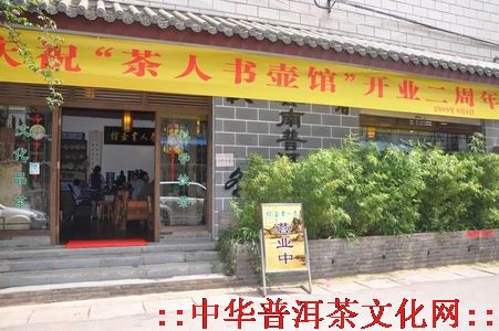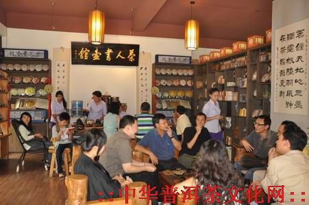 “茶人书壶馆”既是茶品名,又是茶店名。该茶店坐落在昆明环城西路595号云南出版集团宿舍区内,隶属昆明葳盛茶业,成立于2007年8月8日,至今已接待茶人茶友2万人次,大大地方便了片区住户和文人雅士品茗休闲。该店以科学饮茶、文化品鉴为理念,旨在联络读者、作者和茶友之间的情感,诠释茶人与文化与著述之间的联系,把茶与文化更紧密地结合在一起,使中华传统文化和当代文化得以进一步弘扬,茶道精神得以进一步光大。当日,云南省普洱茶协会会长张宝三,云南科技出版社社长王超超,云南科技出版社副社长孙琳,著名茶书作者詹英佩、杨中跃、陈露云、张明春等有关方面的领导及新闻媒体、业界人士近百人参加了活动。大家在轻松、愉快、和谐的氛围中品茗交流,畅叙云茶产业的昨天、今天和明天,就普洱茶的文化发展进行了深入探讨,特别关注在全球金融危机的冲击下,茶产业在低谷中的艰难运行,认为已基本度过了最困难的时期。随着我国经济的逐步回暖,目前已呈现企稳回升的好势头,这对云茶产业来讲是一个吉兆,对茶人来说是一个喜讯。大家纷纷表示加强合作,自强不息,把云茶产业做大做强,为促进边疆经济发展努力奉献。