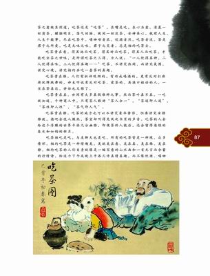 中国人的吃茶有太多太多的意思。在老百姓生活中,茶是用来喝的、用来吃的、用来表情达意的,是开门七件事之一,是和生活息息相关的。他们在饮茶用茶中把茶的滋味感觉、心理感受和社会很好的交融为一体,追求一种极好的生活享受,是和谐的真实反映。如在广东人那里甚至连吃饭都叫吃早茶、吃晚茶,下午还有午茶。在古人那里,还有千里寄茶表示对亲人的思念。在民间旧时行聘以茶为礼,称茶礼,送茶礼叫下茶。谚语道:“一家女不吃两家茶”,即女家受了“茶礼”便不能再接受别家的聘礼。还有以茶敬佛,以茶祭祀等等。在很多少数民族那里,茶叶则是最圣洁的灵物,阿佤人用茶祭“司岗里”祖先,用茶祭太阳神、月亮神,生娃娃道喜,老人去世、劳动干活、腰酸头痛、生疮生病都要用茶、吃茶。哈尼族把茶叶奉为吉祥之物,期望发达兴旺,昌盛繁荣,婚、丧、嫁、娶所有要办的事情离不开米、蛋、茶这三样东西。其用茶的含义是在祈求消灾灭病,清吉平安。他们把茶看作民族神哲学的物质体现。因此茶在边疆各民族中最早用于祭祀,有“无茶不祭”说,将茶与祖先、鬼神、社会交往联系在一起。茶成了上通天神,中达祖宗,下连亲的媒介和信物。吃茶是一种高洁典雅的生活与休闲,茶之为用十分高洁,吃茶之意极其深邃,吃茶还是“吃茶”,在嘴是吃,在心为意。清晨一杯清茶,醒脑明目,荡气回肠。晚间一杯淡茶,安神养心,梳理人生。人生千般事,尽在吃茶中。喝咖啡者浓,饮酒者烈,吃茶者淡。茶是君子之所爱,吃是无味之味。君子之交者,总是相约吃茶去。