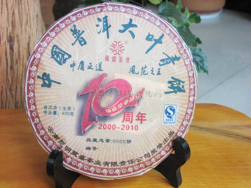 不知不觉间,泡至二十泡时,茶汤滋味渐淡,汤色亦由橙黄渐转,但回甘犹在。这时揭开碗盖,茶香尚在,轻轻拨开叶底,只见叶底粗壮肥硕,叶片厚实,均匀,整齐。品完之后久久回味,的确不失为一款好茶,不仅香、醇、韵、久,还体现了葳盛茶业公司从2000年到2010年走过的风风雨雨,将云南普洱茶文化升华,将民族普洱茶文化升华,将中国普洱茶文化升华,不仅融合了“中庸之道、风范之王”的中国茶文化深厚的内涵和底韵还将云南山美、水美、人美的乔木大叶种原生态普洱茶特色展现得淋漓尽致。 中国普洱大叶青饼精选于云南西双版纳勐腊县古六大茶山乔木大叶古树茶菁为原料而制成的生茶,采摘于大旱之年春季,由于山高谷深,土质肥沃,全年云雾缭绕,即使在红日高照的晴天,也可见山谷云海茫茫,加上露水不断,所以茶树长势颇为旺盛,且芽肥叶厚,香高味浓。 中国普洱大叶青饼的整个制作过程延续百年古董级普洱圆茶的传统制作工艺,用石磨古法压制而成。品藏总量为6666饼,寓意六六大顺,吉祥如意,是一款集品质、品味、品位于一体的经典普洱茶。随着岁月的延伸,它将给您带来健康的享受,精神的愉悦,精彩的人生。 人生如茶,茶如人生,只有品,才知其味,只有知其味,才知其韵,只有知其韵,才能品出人生的甘美,领悟生活的真谛。葳盛茶业公司总经理张明春提出茶界有三品,即人品、茶品、文品。人品,是人的品格;茶品,是茶的品质、品位;文品,是文化的品位。要做茶,做好茶,必须先做好人,做好事,做真人,做真事。在这个前提下,文化+品质,才是最好的普洱茶。如果没有文品的融入,普洱茶的生命是苍白的。没有文化,云南普洱茶文化精髓难以弘扬,普洱茶历史精华更难以传承。 在中国普洱大叶青饼茶的香醇和厚韵中,侵润着岁月的秘香,贮藏着时间的能量。中国普洱大叶青饼是时间的醍醐,是光阴对细节的耐心雕琢;更是一种在岁月流逝中的静默,在这种静默中,生活上升为艺术,这种流动中的和谐,似乎就是自然的旋律,没有突兀,没有炫耀,自然而然。