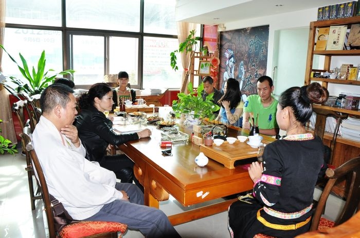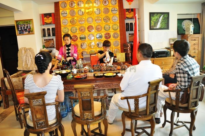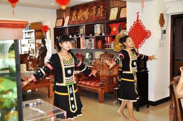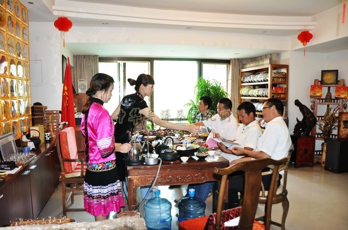 8月19日,以“爱随茶香,尚品生活”为主题的茶叙活动,主要以今年葳盛所研发的新茶中最具特色的三款为主。随着茶友们的到来,首先为茶友呈现的是“凤饼”。凤饼选取云南古茶山乔木古树大叶种晒青春茶为原料精心研制而成,寓意吉祥如意。伴随着茶香,葳盛的两位茶艺师跳起哈尼族传统舞蹈“捣歌”,欢快动听极富民族韵味的音乐,加上美丽姑娘的演绎,让人们沉浸其中、意犹未尽……
