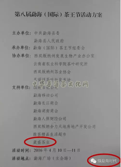 据悉,《第八届勐海(国际)茶王节》将于2016年4月10日~11日在勐海广场举行!爱茶人可直接参与2016春茶订货!葳盛茶业在2016年将推出“哈尼公主感恩茶”、“鸣春私人订制”等系列!敬请期待!