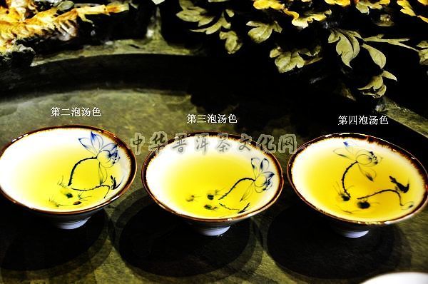 第一泡,汤色浅黄,香气四溢,充满整个屋子,入口甘爽,回甘;第二泡,汤色渐深,香气已入口腔,与茶气在口中混合,口感饱满充实;回甘明显;杯底有花蜜香,且留香持久;第三泡,汤色橙黄透亮,滋味醇厚,汤色透亮;第四泡,汤色黄亮,滋味甘醇鲜爽,香流齿颊之间,久久回味;第五泡,细品,两颊生津,显喉韵;第六泡,回甘,杯底花蜜香减弱;第七泡,出汤时间稍微延长,汤质顺滑,叶片舒展,滋味醇厚,茶气强;第八泡,回甘持久;第九泡……