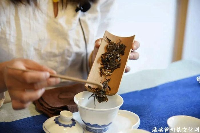 【闻干茶香】温杯洁具后,趁三才碗温度未降前投取适量干茶,轻轻摇晃盖碗,揭盖嗅闻、可闻到明显的兰蜜香。