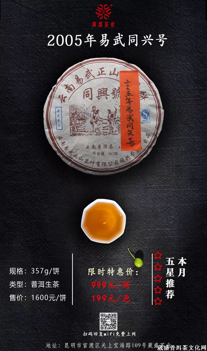 活动内容:原售价¥1600元/饼、357g/饼的2005年易武同兴号普洱生茶,限时尊享¥999元/饼、¥199元/泡。